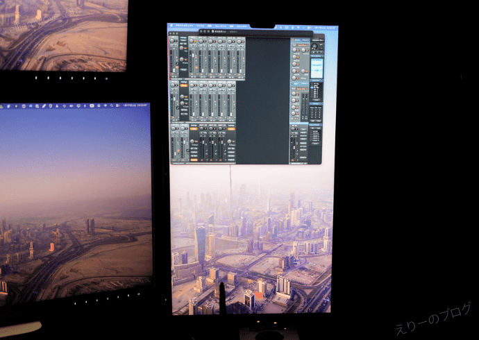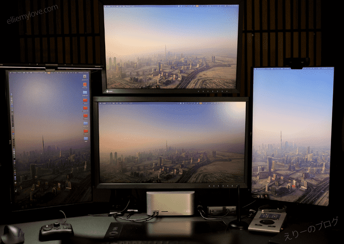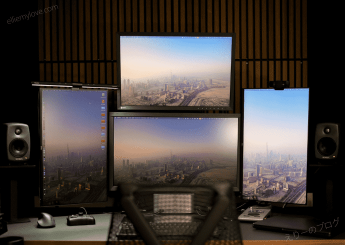 カメラで撮るとどうしても右と上のモニターが明るくなったり暗くなったりするのですが