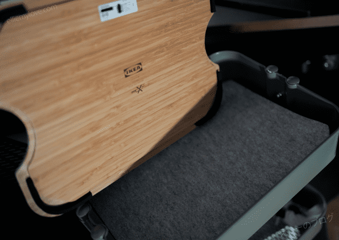 そうすると背面にあるパーティションに引っ掛けている引き出しと干渉するので悩みどころ