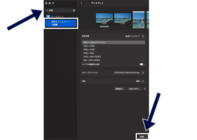 >右下の「配置」をクリック「複数のディスプレイを配置」で、モニターの位置を決められます