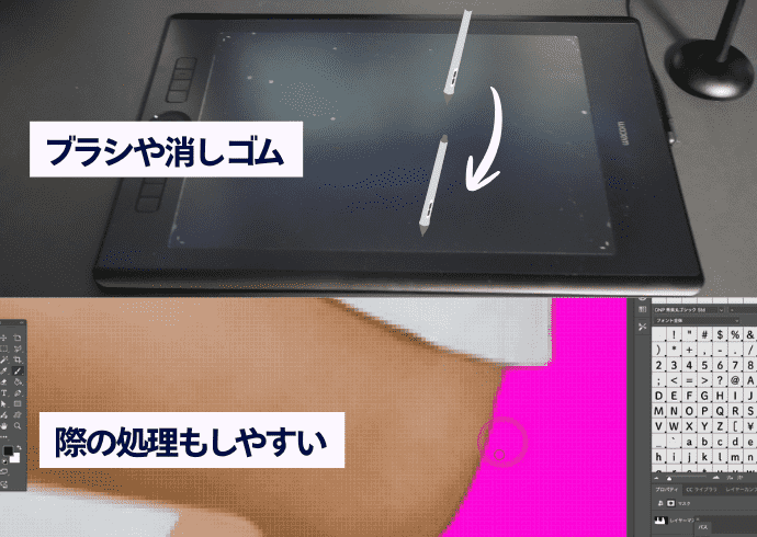 Photoshopでは、人物のキワを取るときなど、マウスよりとっても楽にできます