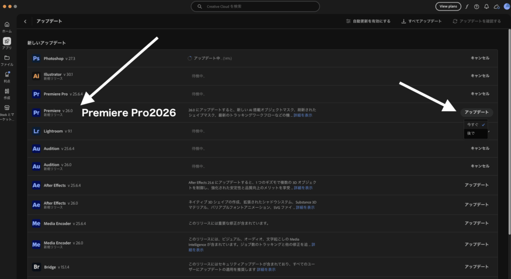 Premiere Pro2026の「アップデート」「今すぐ」を選びます