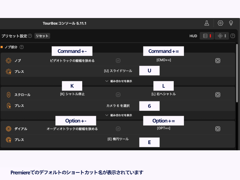 TourBoxコンソール側には、「もともとのPremiereでのショートカットキーの名前」が反映されます