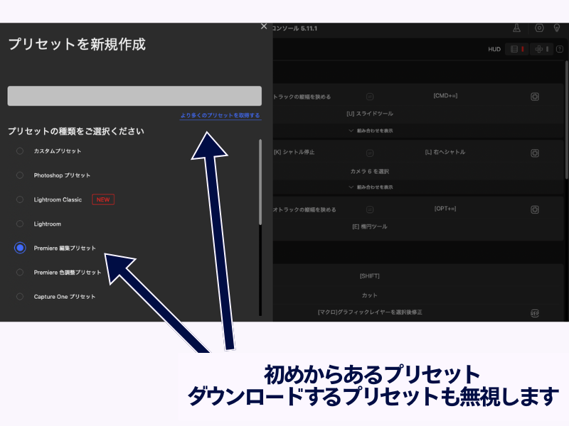 見た目にPremiere編集プリセット・Premiere色調整プリセットが表示されていますが