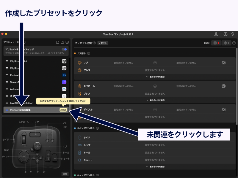 この時点ではTourBoxコンソールの画面をクリックしていきましょう