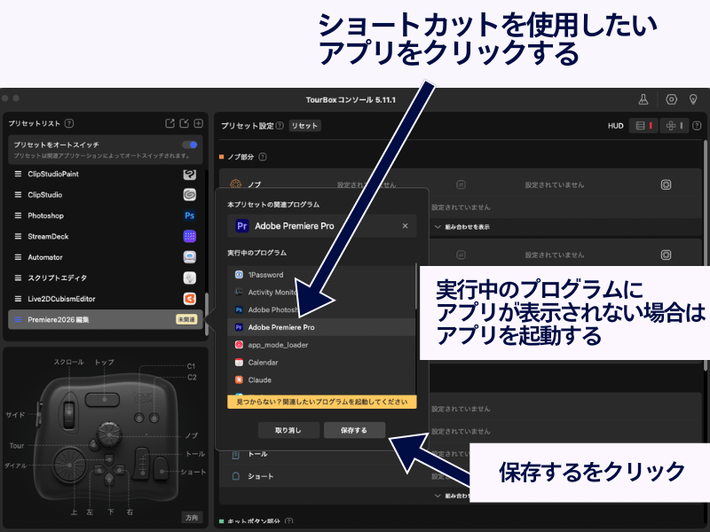 TourBoxコンソールに戻り、設定したいアプリケーションを指定します